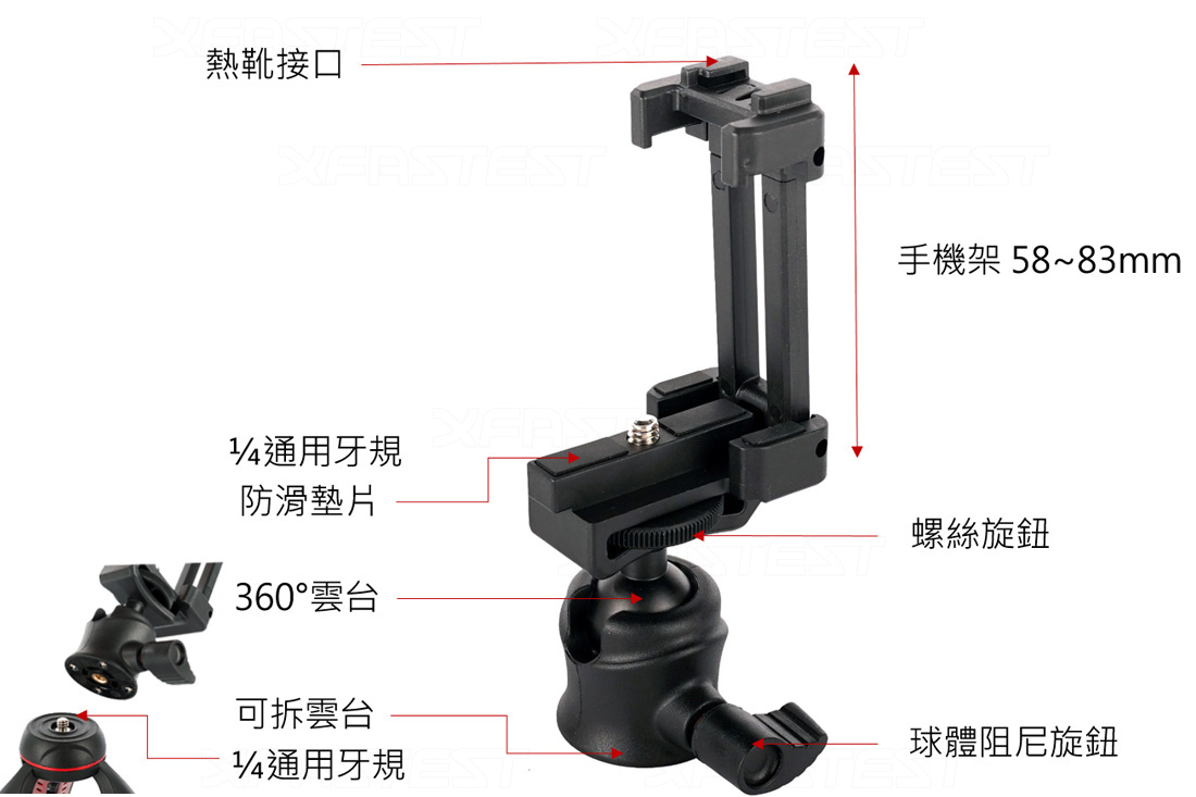 重量輕體積小,讓你外出隨身攜帶不佔空間,腳架模式多變可伸縮、加上360度雲台讓你全方位自由調整拍攝高度及角度;使用腳架時最怕夾一夾手機滑掉,架上架下都有設計防滑貼片,不怕你親愛的手機或相機噴飛摔到,可以安心拍攝安心追劇~